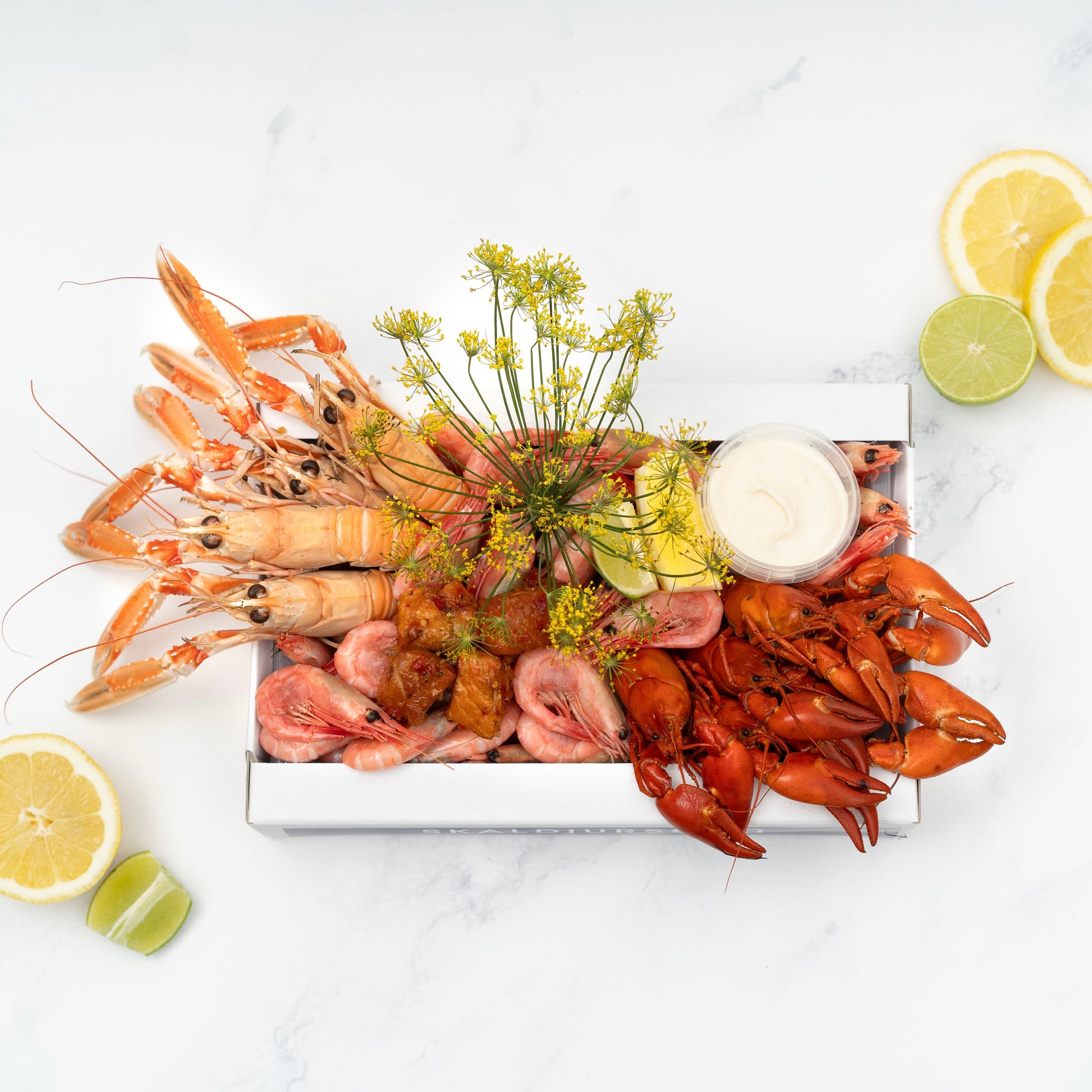 Vår klassiska skaldjursbricka är fylld till bredden med våra mest storsäljande produkter från hav och sjö. Njut av våra egenfiskade handplockade Vätternkräftor tillsammans med havskräftor, våra egensaltade räkor och krämig aioli med varmrökta chili/vitlök laxnuggets på toppen.